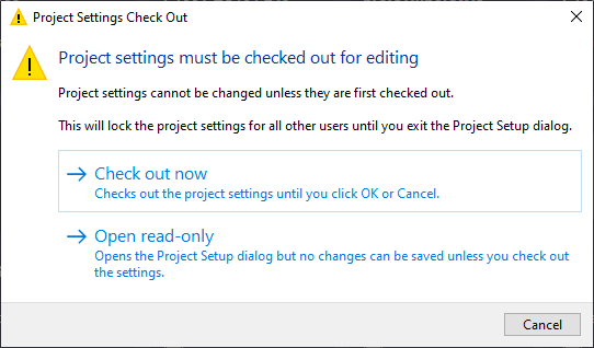 - Open het collaboration project en ga naar de project setup. Zorg ervoor dat de project settings op dat moment niet door een andere gebruiker uitgechecked zijn.