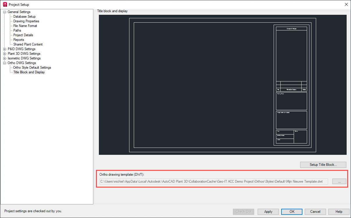 - In de AutoCAD Plant 3D project setup, ga je naar de node Ortho DWG Settings -> Title Block and Display, gebruik de menu knop om de nieuwe template te selecteren.